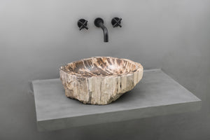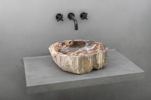 En helt unik og eksklusiv servant i forsteinet tre. Forsteining er en prosess der organisk materiale omdannes til stein gjennom millioner av år. Selv om det i dag er stein, er alle detaljene i det som en gang var tre beholdt, helt ned til mikroskopisk nivå. Et mer naturlig materiale skal du lete lenge etter.