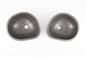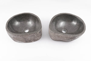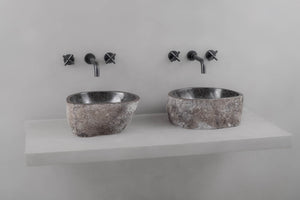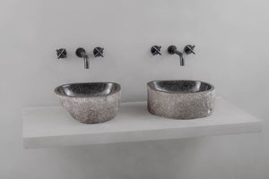Gi badet et gjennomført og eksklusivt uttrykk med to matchende servanter i naturlig formet elvestein fra Bali.