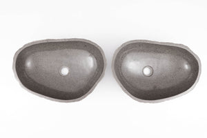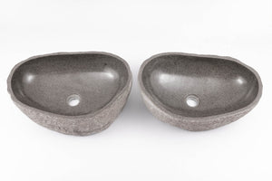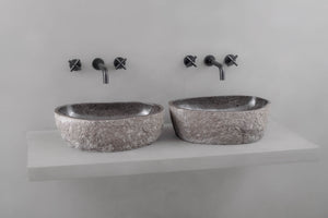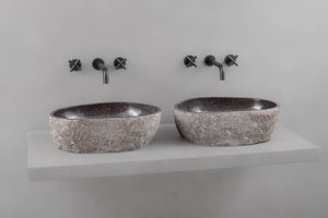 Gi badet et gjennomført og eksklusivt uttrykk med to matchende servanter i naturlig formet elvestein fra Bali.