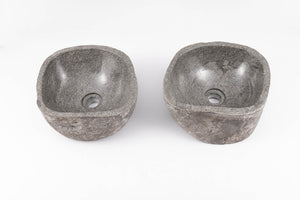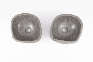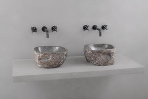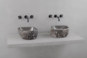Gi badet et gjennomført og eksklusivt uttrykk med to matchende servanter i naturlig formet elvestein fra Bali.