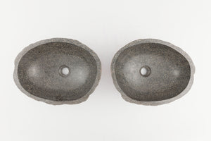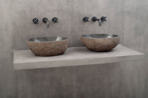 Gi badet et gjennomført og eksklusivt uttrykk med to matchende servanter i naturlig formet elvestein fra Bali.