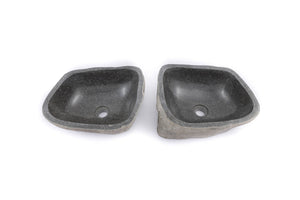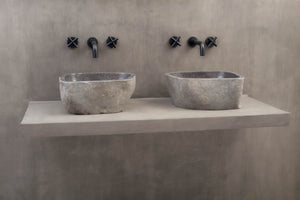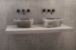 Gi badet et gjennomført og eksklusivt uttrykk med to matchende servanter i naturlig formet elvestein fra Bali.