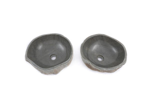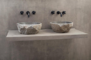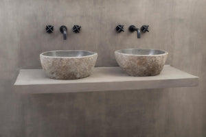 Gi badet et gjennomført og eksklusivt uttrykk med to matchende servanter i naturlig formet elvestein fra Bali.