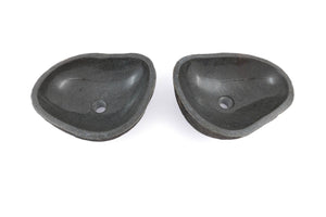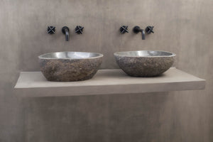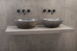 Gi badet et gjennomført og eksklusivt uttrykk med to matchende servanter i naturlig formet elvestein fra Bali.