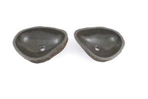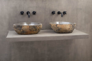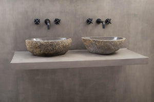 Gi badet et gjennomført og eksklusivt uttrykk med to matchende servanter i naturlig formet elvestein fra Bali.
