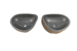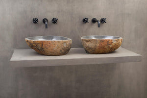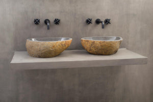 Gi badet et gjennomført og eksklusivt uttrykk med to matchende servanter i naturlig formet elvestein fra Bali.